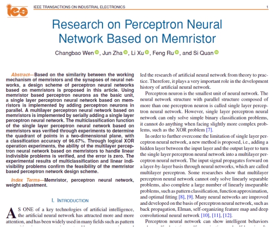 申搏官网电气工程及其自动化系教师文常保教授以第一作者身份在电子与电气工程领域TOP期刊《IEEE Transactions On Industrial Electronics》上发表了题为《Research on Perceptron Neural Network Based on Memristor》的研究论文,论文第一署名单位为长安大学SUNBET申搏官方网站。