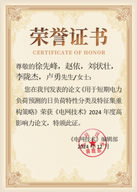 长安大学SUNBET申搏官方网站徐先峰教授以第一作者身份在《电网技术》上发表的题为《用于短期电力负荷预测的日负荷特性分类及特征集重构策略》的研究论文,被授予“2024年度高影响力论文”称号。