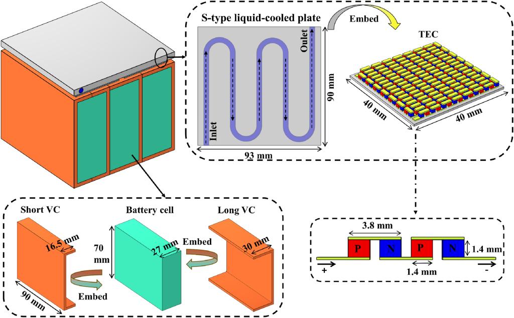 为满足电池在高温环境下运行时对快速冷却的需求,本研究提出了一种集成液冷、VC均热板和热电冷却器的混合型电池热管理系统。研究团队建立了一个非稳态多物理场耦合模型,综合考虑传热、流体流动和电场效应,用以评估该系统的热响应特性。对比分析结果显示,未集成TEC的BTMS无法将电池温度降至313.15 K以下,而所提出的新型电池热管理系统在冷却效果上显著优于传统的空气冷却方案。在冷却剂流速低于0.12 m/s、TEC输入电流低于3 A的运行范围内,适度提升这两个参数有助于改善系统的热性能。但考虑到收益递减现象,过高的流速与电流不仅带来较低的性能提升,还导致不必要的能耗。具体而言,当冷却剂流速为0.12 m/s、TEC输入电流为3 A、放电倍率为3 C时,系统冷却所需时间为630 s,电池组最大温差大于5 K的持续时间为640 s,冷却速率达到1.905 K/min。此外,即使在更高的放电倍率下,该系统依然表现出良好的冷却能力,满足相应工况下的热管理需求。本研究为高温运行条件下锂离子电池的热管理提供了新的理论依据与设计思路,有助于推动高性能BTMS的开发与优化。