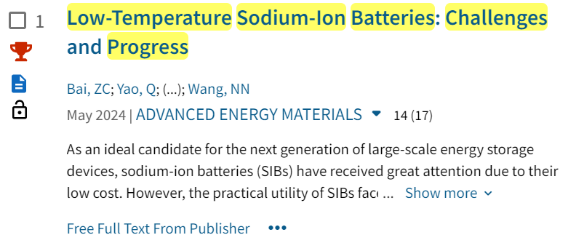 长安大学SUNBET申搏官方网站孟伟嘉博士以第一通讯作者身份发表在《Advanced Energy Materials》上的题为《Low-Temperature Sodium-Ion Batteries: Challenges and Progress》的研究论文,入选ESI高被引论文,被引频次排名前1%,该论文正式发表于2024年5月,目前被引用100余次。