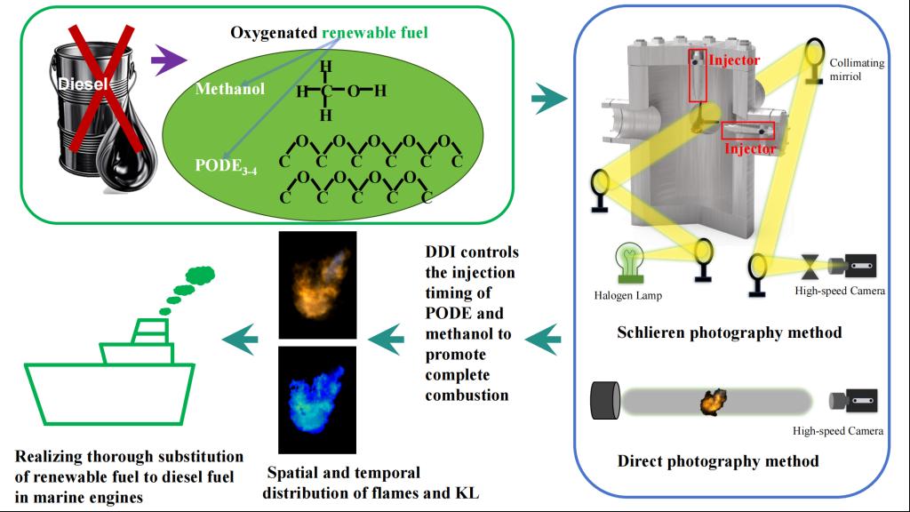论文信息:Wang T, He J, Chen H, Zhang P, Liu Y, Li B, et al. Visual research on cross-spray and combustion of PODE/methanol fuels under various injection timings. Applied Thermal Engineering. 2025;278:127392.