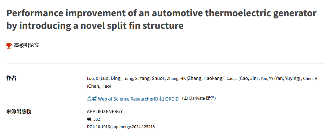 长安大学SUNBET申搏官方网站罗丁副教授以第一作者身份发表在《Applied energy》上的题为《Performance improvement of an automotive thermoelectric generator by introducing a novel split fin structure》的研究论文,入选ESI高被引论文,被引频次排名前1%,该论文正式发表于2025年3月,目前被引用28次。