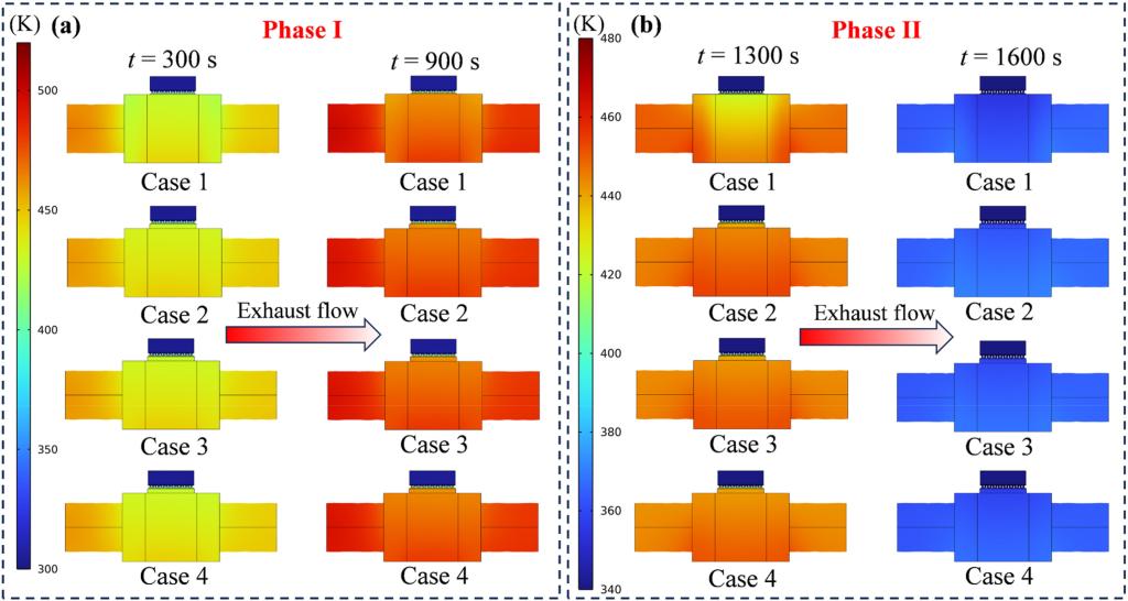 为了提升车辆行驶工况下热电发电机(TEG)的发电量并降低其性能波动,研究团队设计了一种在换热器与热电模块之间集成相变材料(PCM)的PCM-TEG系统,通过建立包含PCM相变过程的瞬态CFD与热电混合数值模型,结合实验验证(模型输出电压与功率的实验值和模拟值一致性良好,输出电压RMSE为0.141V、R²达0.927),研究了PCM在真实车辆行驶循环(NEDC)下对TEG性能的影响,同时提出“波动系数”这一新型评价指标以量化TEG性能参数的波动程度;此外,该研究还系统分析了PCM内部翅片设计(如有无翅片、翅片高度)和PCM体积(通过改变底面积或厚度实现)对提升PCM传热性能及PCM-TEG性能输出的作用。最终证实PCM可使TEG功率波动系数最大降低32.81%,且通过优化PCM传热性能,能在降低5.71%功率波动的同时,使TEG总发电量提升3.23%、有效转换效率提升2.19%。该研究为动态工况下PCM-TEG的设计与热优化提供了关键理论依据。