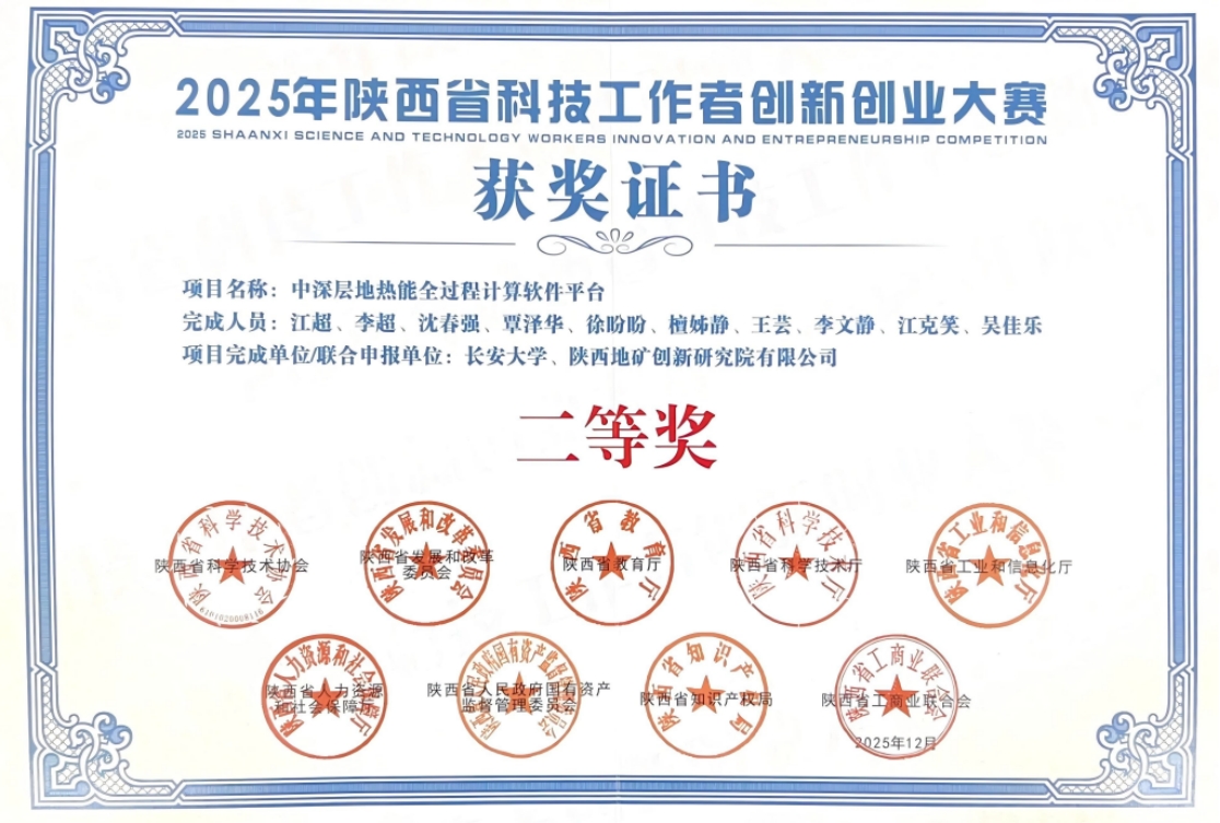 2025年11月,陕西省科技工作者创新创业大赛在西安举办。SUNBET申搏官方网站青年教师李超作为第二参与人,与建筑工程学院江超老师主持完成的《中深层地热能全过程计算软件平台》荣获二等奖。