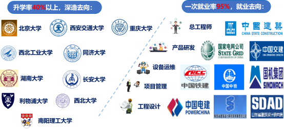 近几年毕业生一次就业率稳定在95%以上,升学率40%以上。就业学生中90%以上进入中国建筑集团有限公司、国家电网公司、中国铁建股份有限公司、中国交通建设集团、中国能源建设股份有限公司、中国电力建设集团、南方电网公司、隆基股份等央企等及国内大型知名企业,从事建筑或电力设计、建设、运维和管理工作,大部分毕业生已成长为技术和管理骨干。