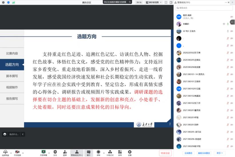 纸上得来终觉浅,绝知此事要躬行。本次会议旨在帮助同学们全面了解寒假社会实践活动以及“挑战杯”红色专项的详细规则,鼓励同学们在假期中走出家门,接触社会。与此同时,希望同学们能深刻体悟红色文化,感受党的红色精神伟力,增强文化软实力,厚植红色基因,努力成长为新时代中国特色社会主义接班人。