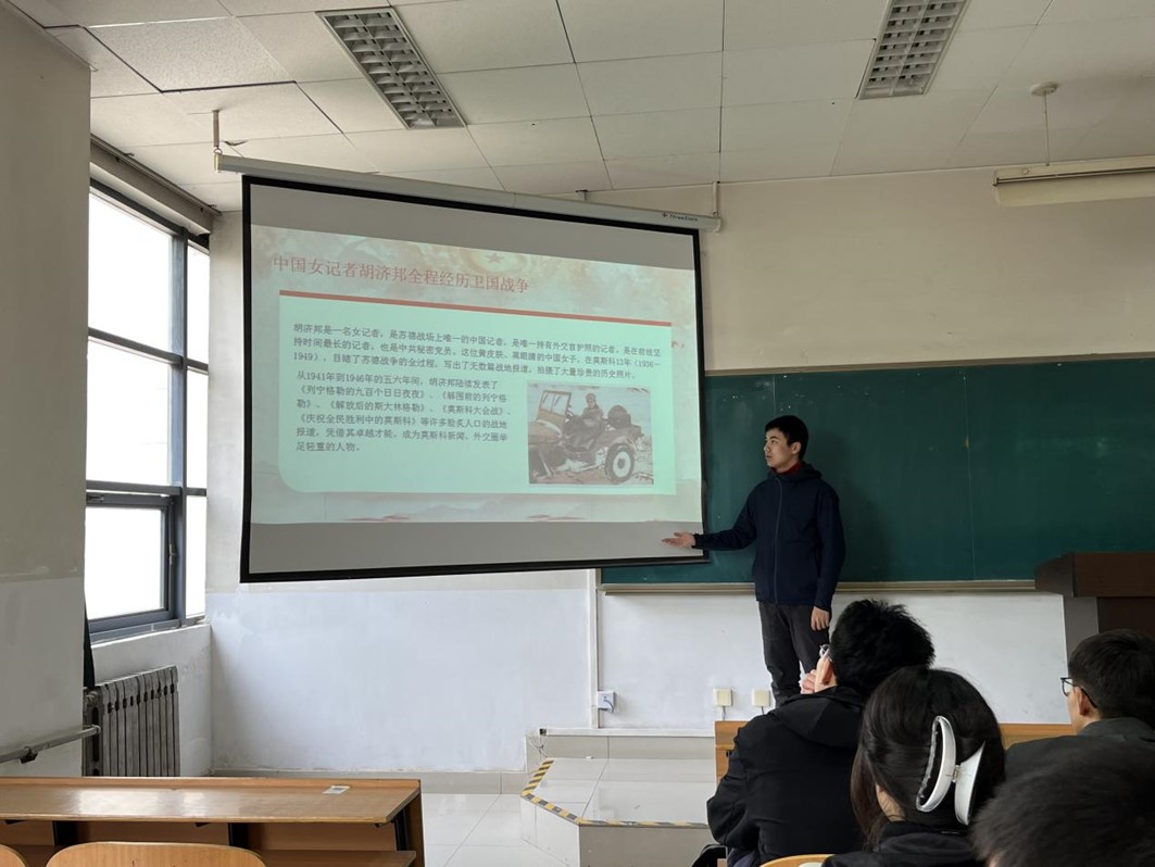 会议第三项内容,由程子墨讲述中国女记者胡济邦全程经历卫国战争的故事,她在枪林弹雨中不畏艰险、在外交工作中卓越出色的表现为党、为国家做出了巨大贡献。