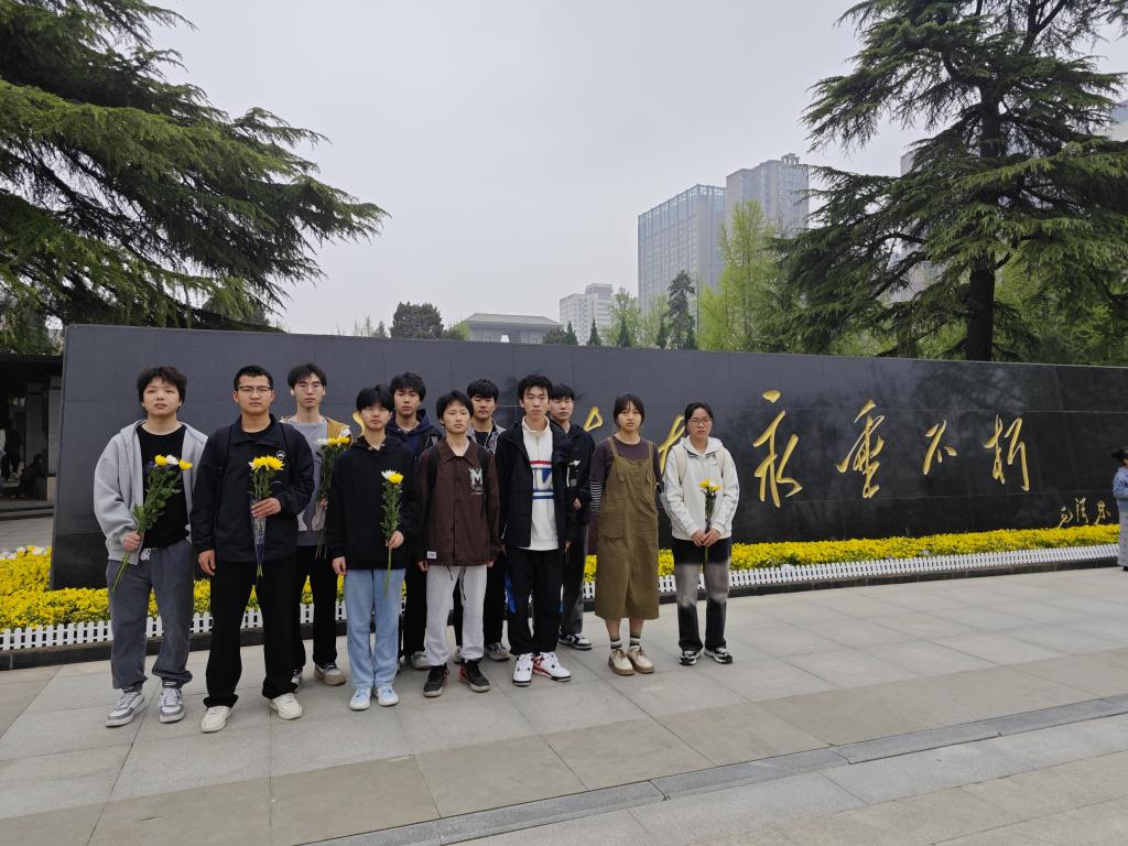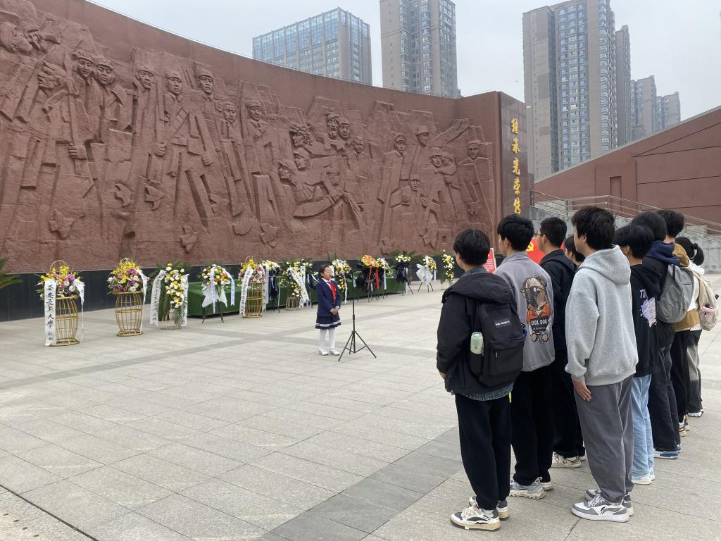 随后,在烈士浮雕广场举行祭扫仪式。全体同学肃立于纪念碑前,集体默哀一分钟,向为国家、为民族英勇斗争、壮烈牺牲的英烈们表达敬意与怀念。默哀结束后,团员代表魏鑫和白子墨向雄伟的革命烈士纪念碑敬献花篮,表达最真诚的敬意。