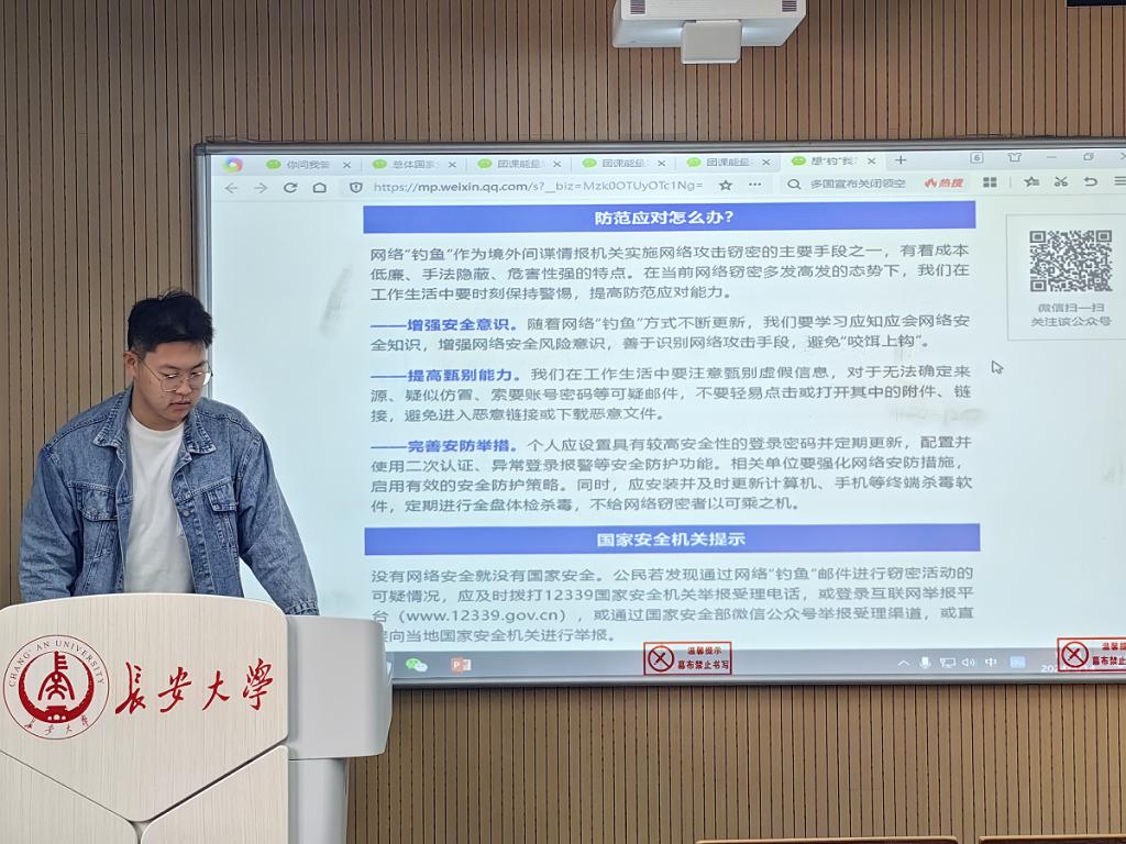 4月15日,申搏官网2023级能动1班以全民国家安全教育日为契机,在WX2305教室开展“国家安全 青春挺膺”主题团日活动,引导团员青年提升国家安全意识和素养,增强维护国家安全的思想和行动自觉。活动由团支书许可主持。
