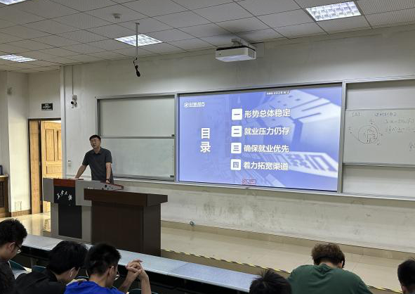 李金檑介绍了2020级本科毕业生升学就业概况,他通过数据图表解析了升学深造院校和就业结构,并针对性的对2020级能源与动力工程以及电气工程及其自动化专业的就业特点进行举例分析,向同学们展现了许多可能的就业渠道。
