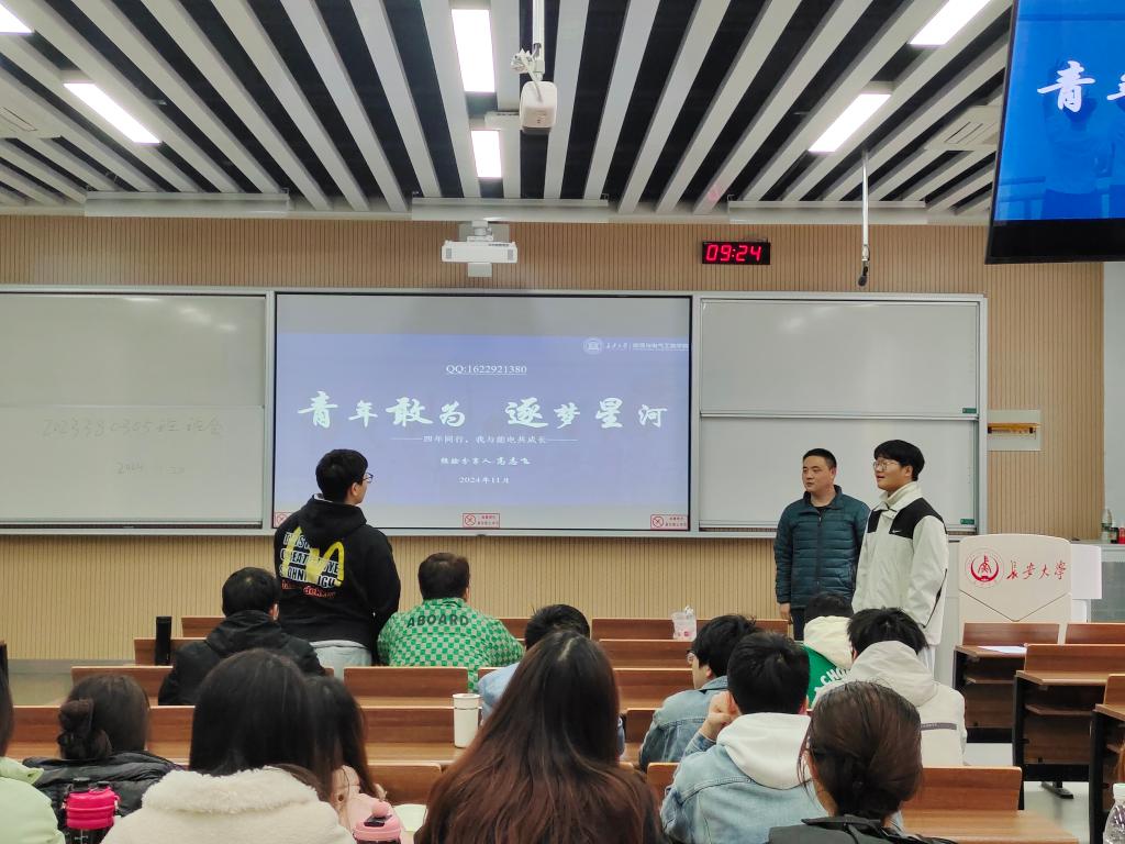 在许桂敏老师对本次班会的主题与目的进行说明并对高志飞同学的情况做简要介绍后,高志飞以“青年敢为,逐梦星河”为题,从课程学习、科研竞赛、社会实践、学生工作和大学生活五个方面,分享了他的经验与心得,鼓励大家不仅要扎实学业,还要精于时间管理,勇敢追求梦想,发掘新的兴趣,与同学建立深厚的友谊,培养健康的生活习惯,以及在压力下寻找内心平静与生活平衡。高志飞学长真诚倾囊相授,为学弟学妹们传递了满满的干货和正能量。