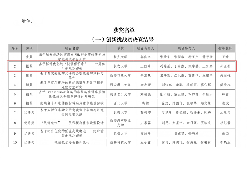 2025年9月,由共青团陕西省委、陕汽控股集团联合主办,陕汽控股团委、西安工业大学团委联合承办的第十五届“挑战杯”陕汽集团陕西省大学生课外学术科技作品竞赛校企联合专项赛暨陕汽重卡第八届卡车无限创意大赛圆满落幕。由申搏官网孙亚松老师指导,王佳琦、冯瀚星、丁希杰、张宇赫、王梦娇同学完成的作品《基于拓扑优化的“低温保护伞”——叶脉仿生电池冷却板》荣获创新挑战赛决赛银奖。