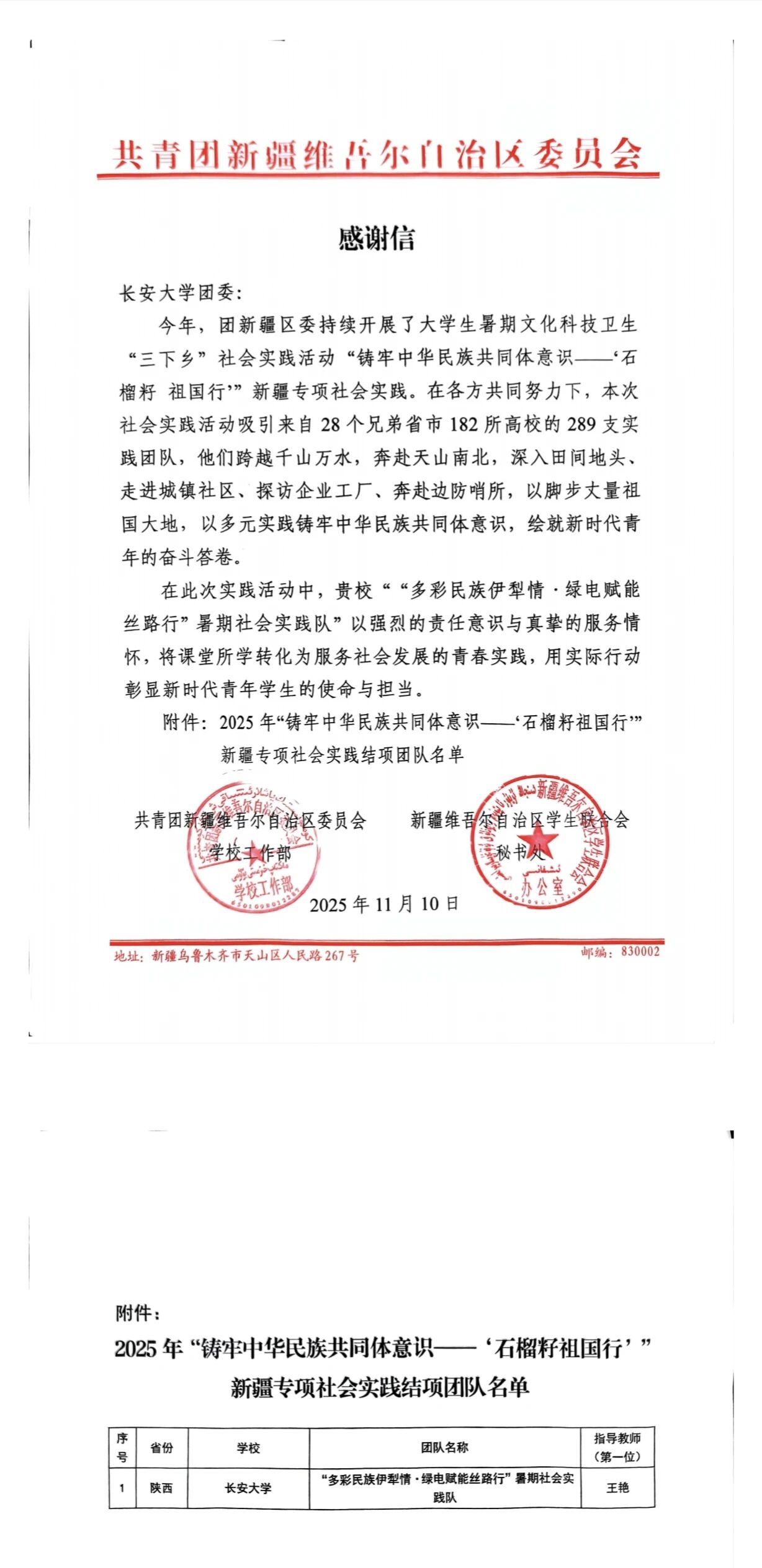 近日,共青团新疆维吾尔自治区委员会向申搏官网实践队发来感谢信,对申搏官网“多彩民族伊犁情·绿电赋能丝路行”社会实践队在2025年大学生暑期文化科技卫生“三下乡”社会实践活动“铸牢中华民族共同体意识—‘石榴籽 祖国行’”新疆专项社会实践中作出的积极贡献予以表扬和感谢!