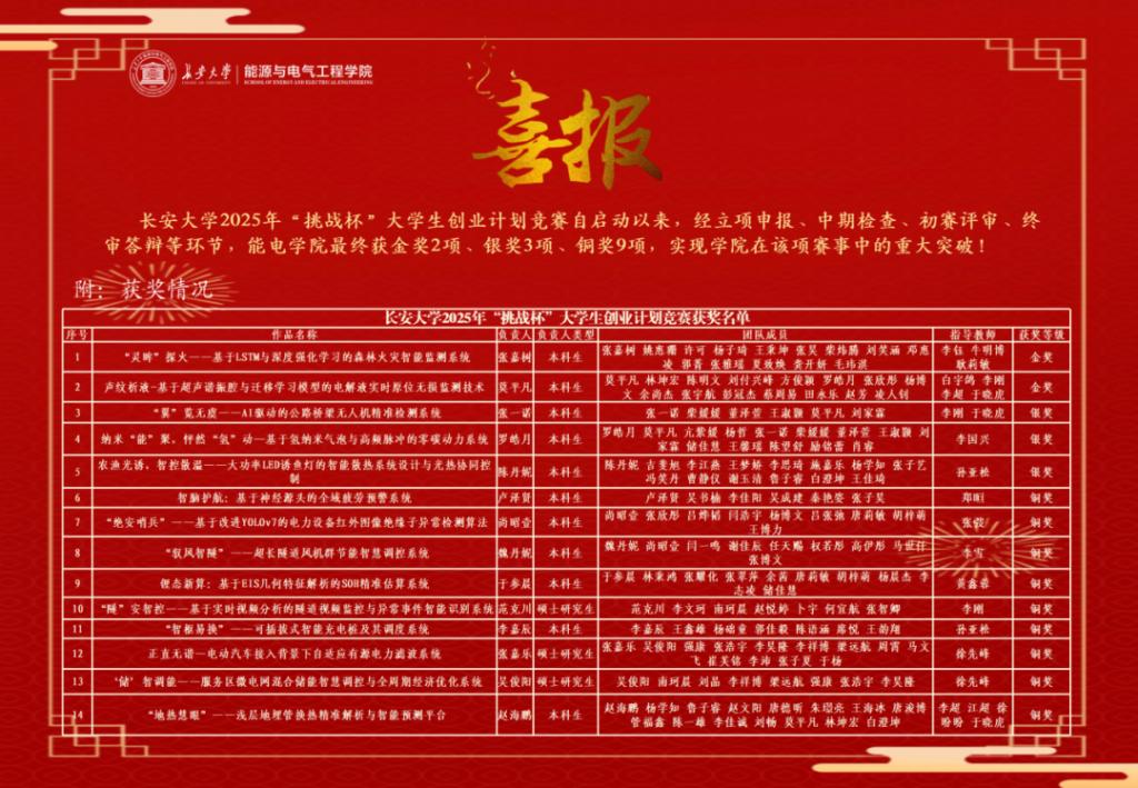 长安大学2025年“挑战杯”大学生创业计划竞赛自启动以来,经立项申报、中期检查、初赛评审、终审答辩等环节,SUNBET申搏官方网站最终获金奖2项、银奖3项、铜奖9项,实现学院在该项赛事中的重大突破!
