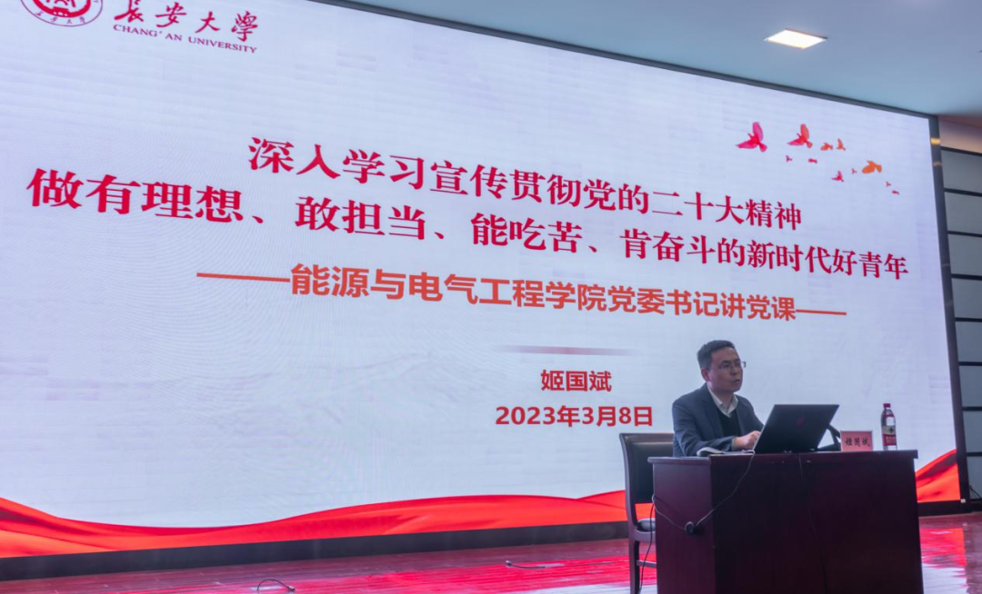 为深入学习宣传贯彻党的二十大精神,3月8日晚,学院党委书记姬国斌在北辰楼会议中心二楼报告厅作了题为《深入学习宣传贯彻党的二十大精神 做有理想、敢担当、能吃苦、肯奋斗的新时代好青年》的专题党课。学院2022年以来入职的教职工党员和全体学生党员参加。