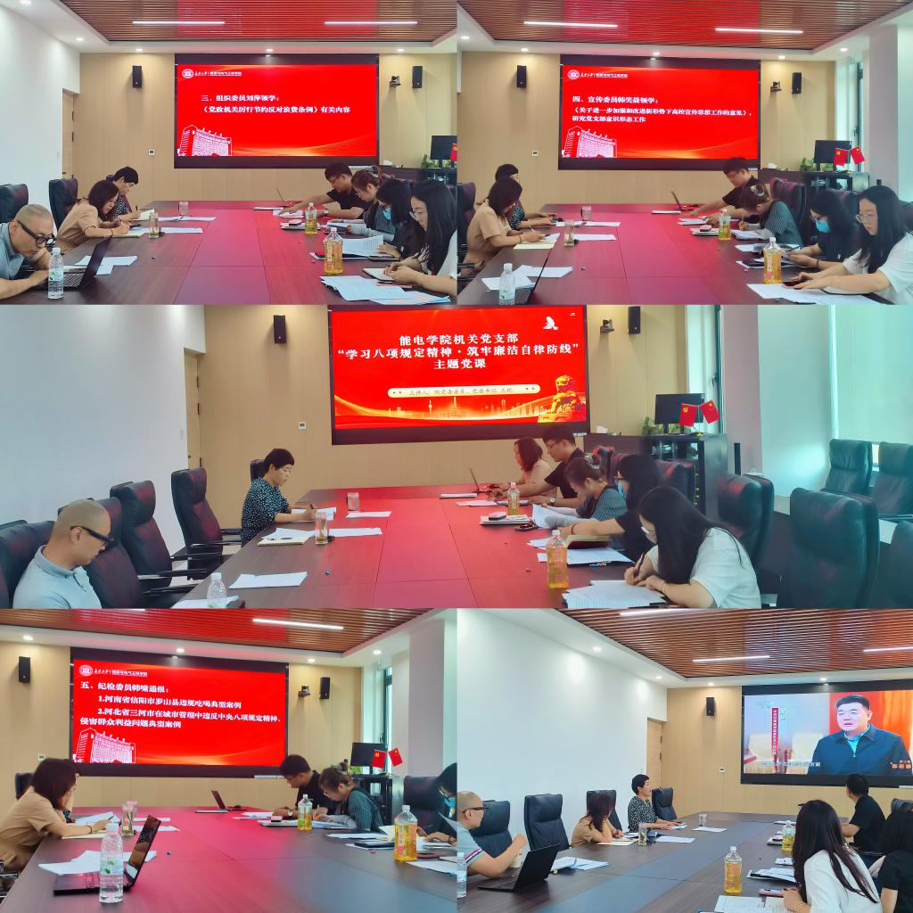 联系支部党委委员、院党委书记王艳为支部党员讲授“学习八项规定精神・筑牢廉洁自律防线”主题党课,从中央八项规定内容、习近平总书记关于中央八项规定精神重要论述、如何开展“深入贯彻中央八项规定精神学习教育”几个方面展开,要求支部党员要带头改进机关工作作风,严格遵守中央八项规定精神各项要求,更好地为学院事业发展做好管理服务保障。院党委副书记、副院长、纪委书记倪凤英详细解读了《中共长安大学委员会贯彻落实中央八项规定精神及实施细则的实施办法》有关内容。支部各支委结合岗位职责,传达领学《党政机关厉行节约反对浪费条例》《关于进一步加强和改进新形势下高校宣传思想工作的意见》等文件内容,通报违反中央八项规定精神典型案例。全体成员集中观看电视专题片《零容忍》中有关教育系统腐败的案例片段。王霄还就党支部意识形态工作和师德师风建设工作做了安排和部署。